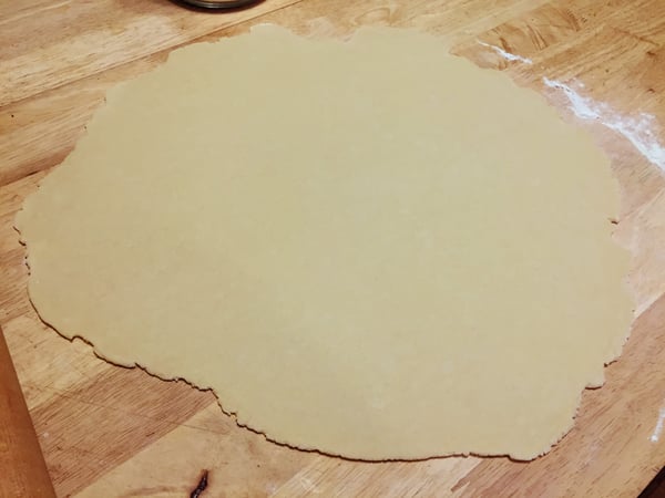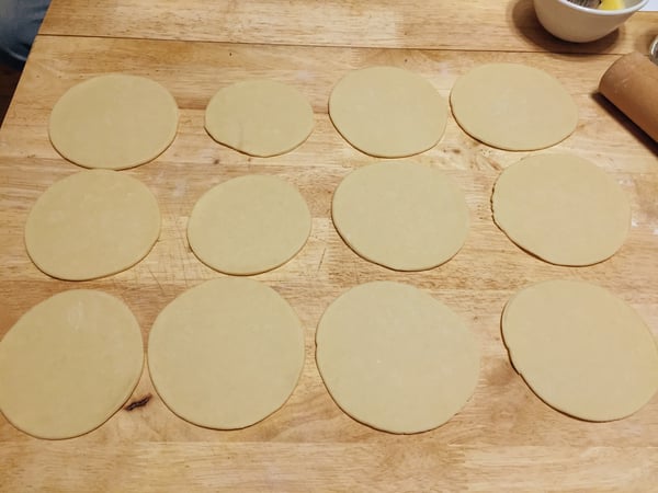 12. While the filling is cooling, roll out the empanada dough. On a lightly-floured surface, roll out the dough until it is 1/8-inch thick. Using a 4- to 5-inch biscuit cutter, cut the dough into approximately 12 circles.