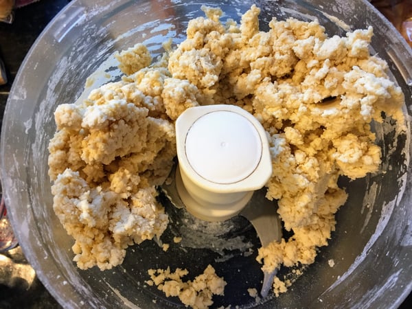 - Add the cold butter, and pulse until you have a crumbly texture. Add the egg, cold water and vinegar, and process until the dough just comes together.