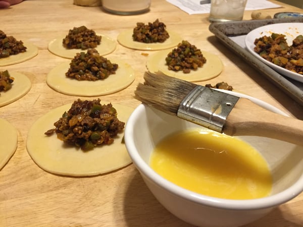 15. Place the empanadas on the prepared sheet tray, and lightly brush the tops with egg wash.