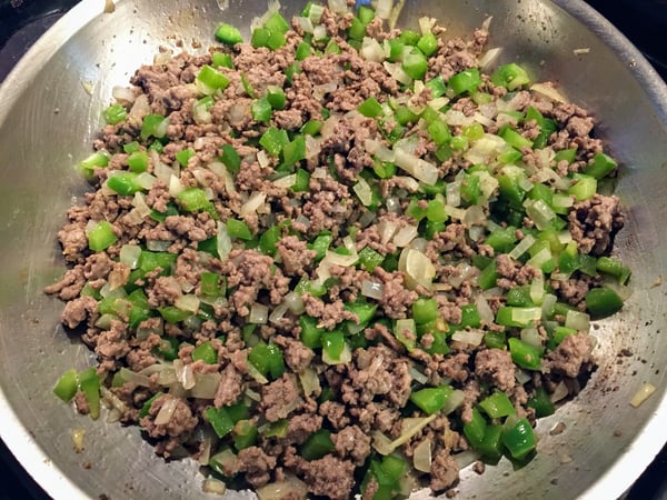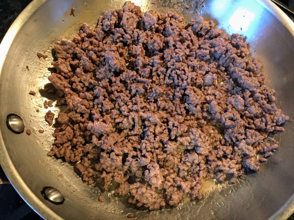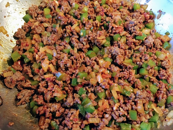 - To prepare the filling, heat a sauté pan over medium heat and add the olive oil. Sauté the beef, breaking it up with a spoon, until just cooked through. Drain all but 2 tablespoons of the fat.