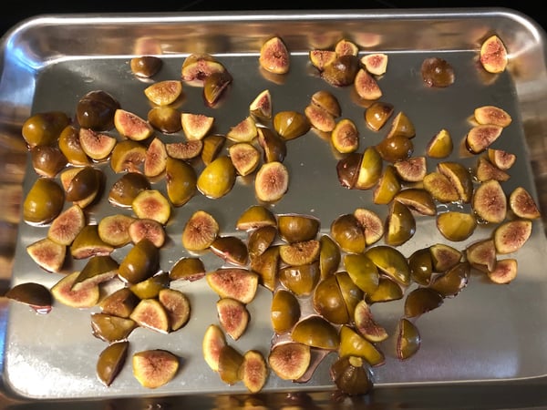 This was a total experiment, so I don't have a strict recipe to follow so feel free to play around with this. I quartered about 2 cups of figs and spread them out on a sheet tray and roasted them in the oven for about 20 minutes at a low temp of 250 degrees. I was attempting to dry out the figs a bit, and I chose not to add sugar like we did when roasting the figs for the ice cream since these would eventually be mixed with simple syrup.