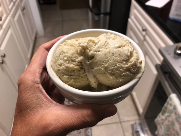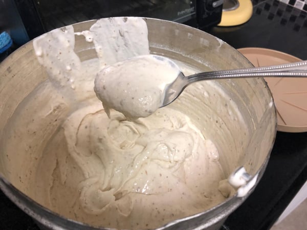 - When the ice cream is almost done add the pureed figs and allow it to mix through.