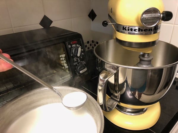- Pour the mixture back into the saucepan and return to a medium low heat and stir and check the consistency by turning the spoon over and running your finger through the mixture that has coated the spoon. If the line from your finger remains clear, then the custard is ready.
