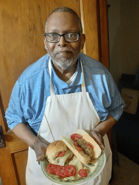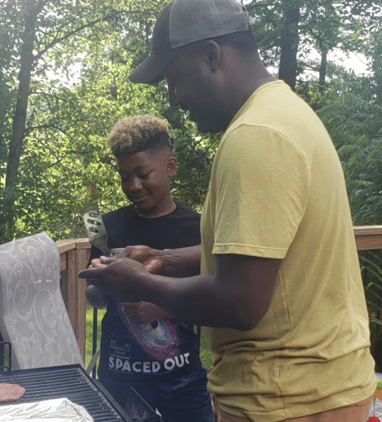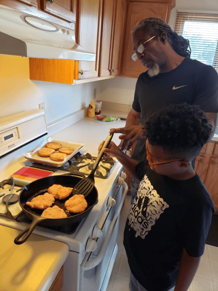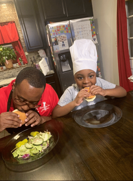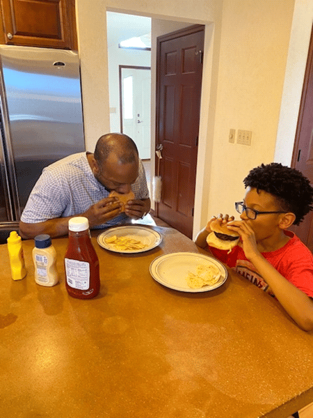 Tre and Johnnie cooking and eating burgers on a Saturday