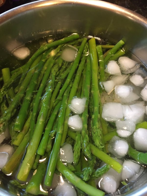2. Transfer the asparagus to a bowl of ice water to stop the cooking process and to set the chlorophyll. This step is called shocking.