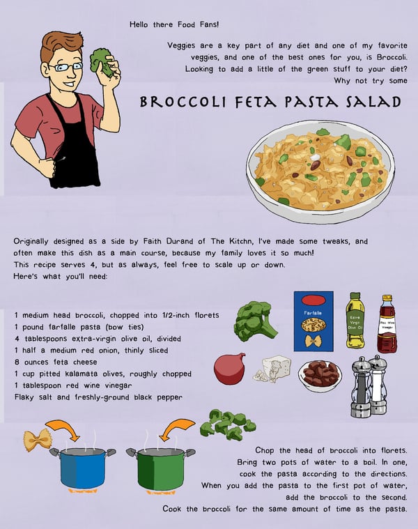 We are pleased to introduce Food Comics from The Chopping Block where our resident Cartoonist Tom O'Brien illustrates his cooking adventures. Here, he shows us how to make a tasty pasta salad and even provides a way to lighten it up at the end.