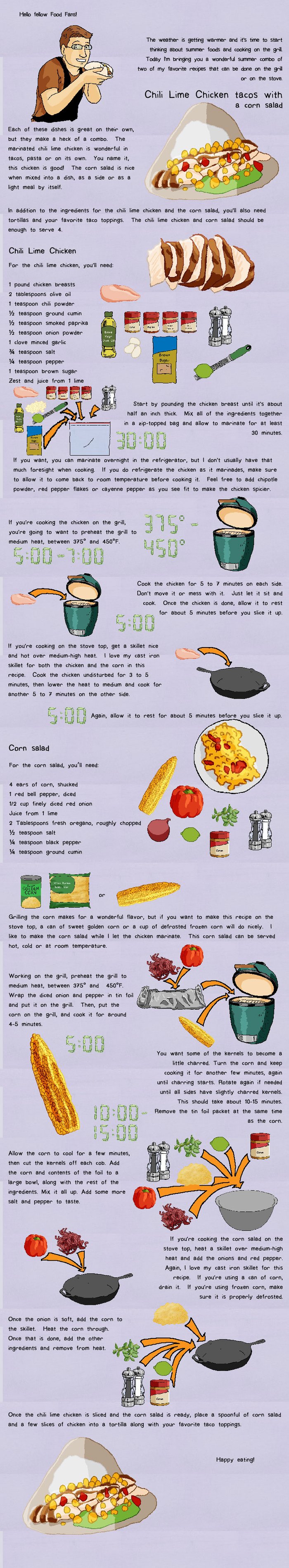We are pleased to introduce Food Comics from The Chopping Block where our resident Cartoonist Tom O'Brien illustrates his cooking adventures. Here, he shows us how to make Chili Lime Chicken Tacos with a Corn Salad. This dish can be prepared on either the grill or stove so it's a perfect fit for any season!