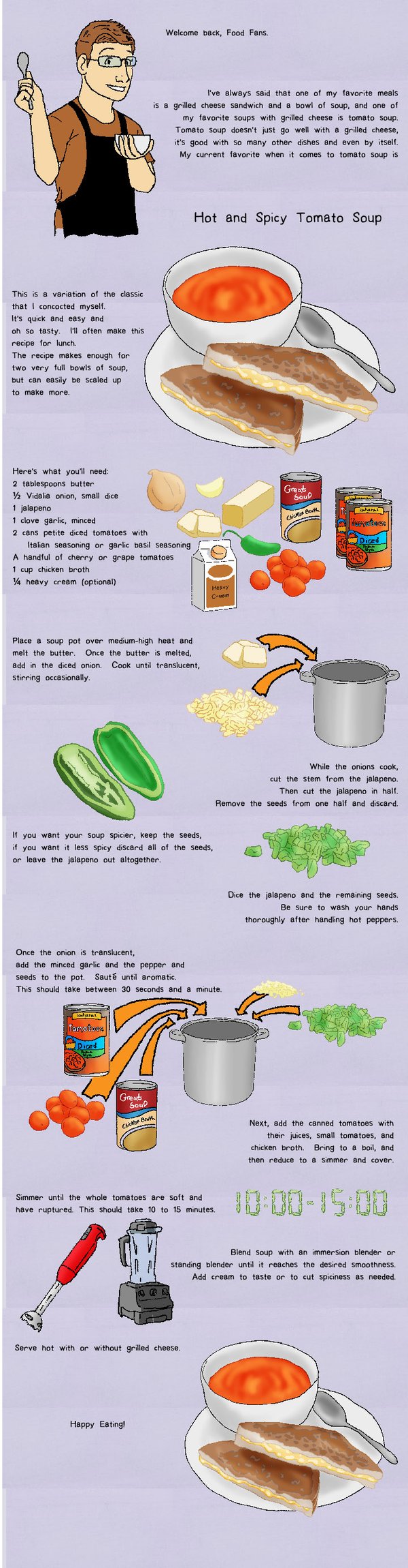 We are pleased to introduce Food Comics from The Chopping Block where our resident Cartoonist Tom O'Brien illustrates his cooking adventures. Here, he shows us how to make the perfect accompaniment to a grilled cheese sandwich, his take on the classic Tomato Soup.