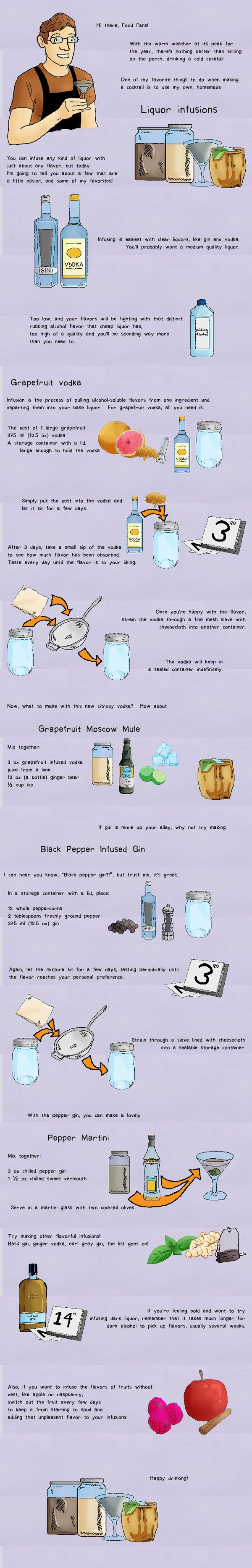 We are pleased to introduce Food Comics from The Chopping Block where our resident Cartoonist Tom O'Brien illustrates his cooking adventures. Here, he shows us how to improve your summer cocktails with homemade liquor infusions full of flavor.