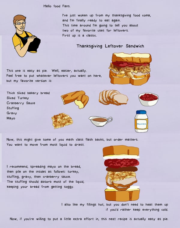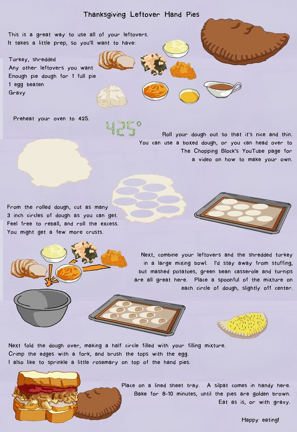 We are pleased to introduce Food Comics from The Chopping Block where our resident Cartoonist Tom O'Brien illustrates his cooking adventures. Here, he shows us two ways to utilize all of your Thanksgiving leftovers with a classic sandwich and innovative hand pie.