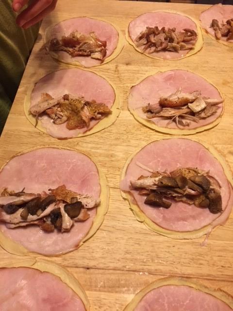 To assemble the crêpes, lay them out on your work surface with the lacy, golden brown side facing down. Top each crêpe with a slice of the ham, followed by some shredded chicken, and finish with a generous sprinkle of cheese.