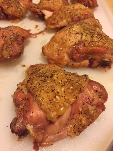 - Season skin on, bone in chicken thighs with salt and pepper, and roast at 425º until the skin is golden brown and crispy. This took about 35 minutes. On a side note… that crispy skin was a real treat to snack on once it cooled down a bit!