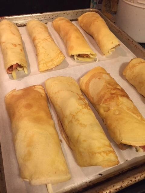 Roll the crêpes up (my son, Jake, said it was just like rolling sushi but easier), and place them seam side down on a parchment-lined sheet tray.