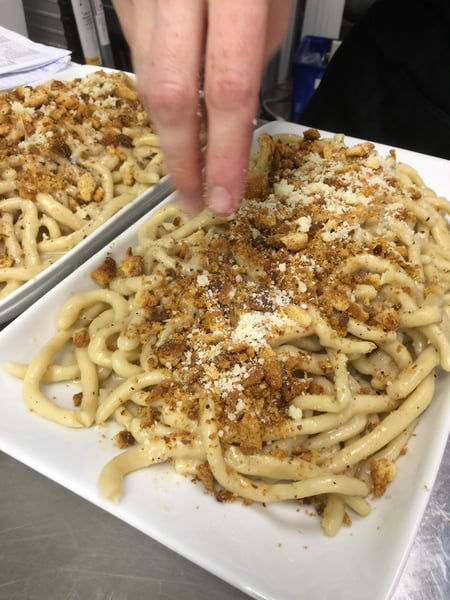 Pici’s inherent variability in texture, ranging from tender to chewy, changes the diner's experience from bite to bite. It is typically paired with a hearty sauce like a pork or wild boar ragú or the super simple cacio, pepe e briciole (cheese, black pepper, and toasted bread crumbs) to truly let the pasta shine.