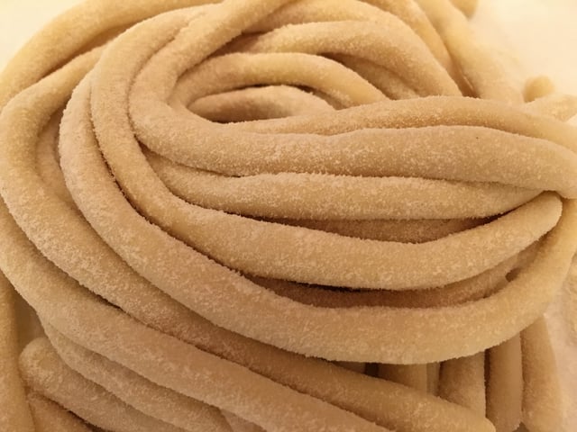When I moved to Tuscany, it was to work in a small rustic Slowfood restaurant in a little Tuscan town in the province of Siena. One of the most loved pasta shapes created in Siena is Pici, a rustic hand-rolled rope-shaped pasta similar in shape to spaghetti but much thicker. Few restaurants, even in Tuscany, still roll their Pici by hand (preferring the much quicker and easier extrusion method) but I was lucky enough to work for a restaurant that still practices that dying art and I learned to meticulously roll each strand of Pici by hand.