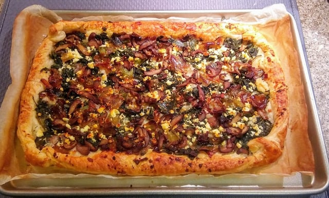 Bake at 425F for 25-30 minutes or until nicely browned. To check for doneness, lift the pastry with a spatula to make sure the bottom is fully baked. Remove from oven, cut and serve immediately. If it looks too dry, you can brush the entire tart with a little olive oil to give it a nice sheen.