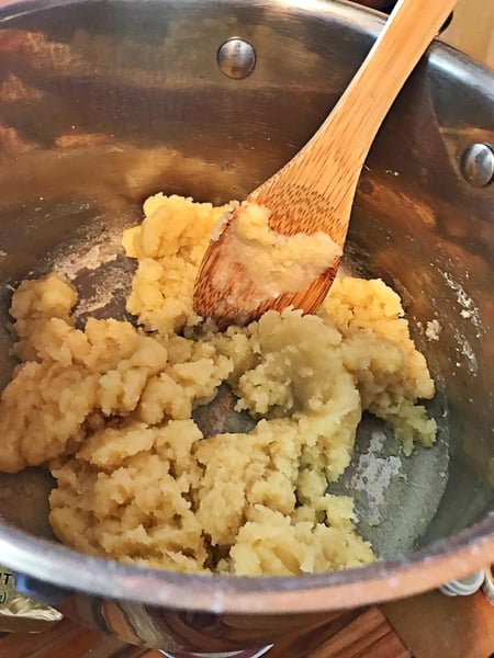 Next you stir, stir, stir to combine your flour mixture and to evaporate out as much of the water as you can from the mixture. Once the mixture begins to coat the bottom of your pan, you’re ready to move on to the next step.