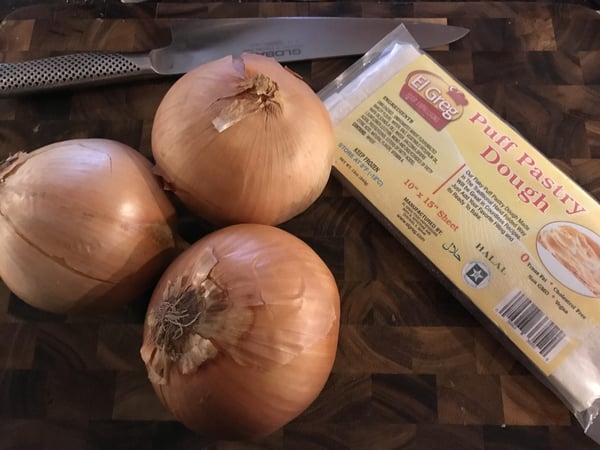 I was put in charge of making an appetizer for a holiday party, and I had a bunch of onions, and some puff pastry in my freezer. I had made French onion soup a week before, and had quite a few fixins left. I had also worked our Fun & Fancy Holiday Cookies class that week, where red & green holiday palmiers were made. So all of this is where my inspiration for French onion palmiers came about. I add two ingredients not traditional to French onion soup: brown sugar and soy sauce. French onion soup is traditionally made with beef stock, and a small amount of soy sauce and brown sugar help add some richness that would normally come from beef stock.
