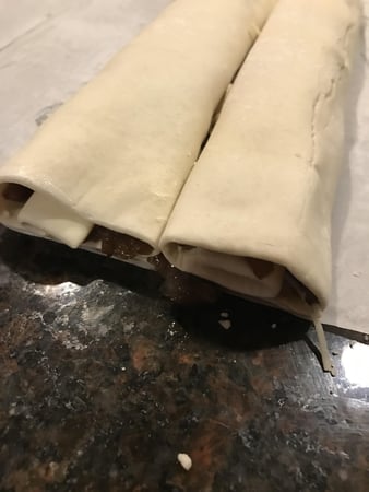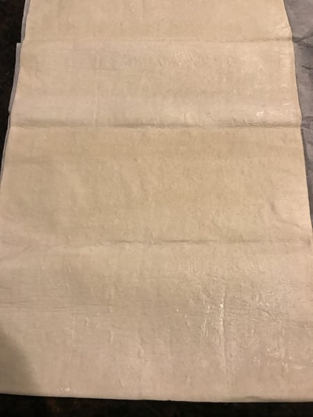 Once your onion mixture is cooled, roll your puff pastry on your counter into a rectangle, about 13-15 inches. (If your puff pastry already comes in a rectangle, you can skip this step.)