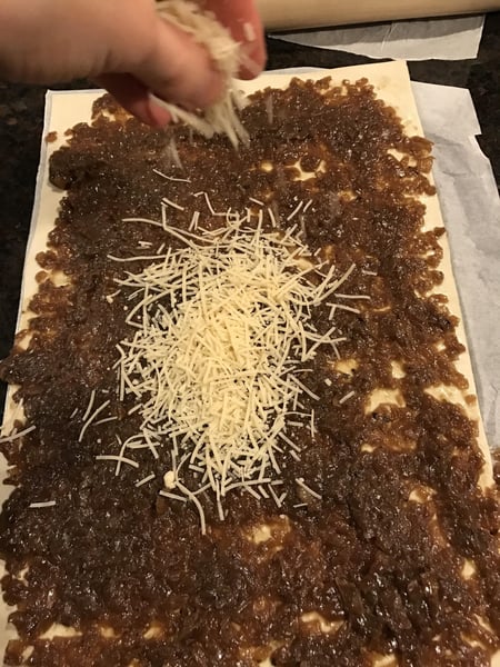Spread your onion mixture in a thin, even layer over the puff pastry. You may not need all of your onion mixture, but make sure to only use a thin, even layer (this would be a great time to add your vegan cheese).