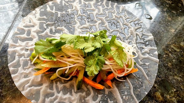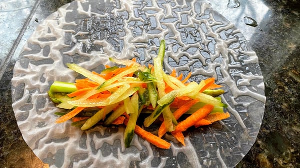 3. To assemble the roll, place a small amount of the rice noodles, cucumbers, carrots, scallions, bean sprouts and herbs about 1 inch from the bottom of the rice paper.