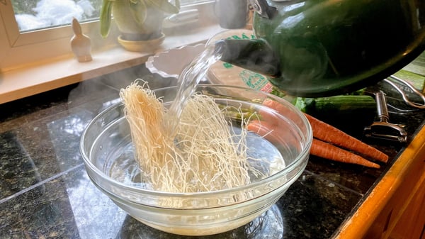 - Place the rice noodles in a medium size bowl. Cover with boiling water and allow to sit for about 10 minutes or until softened. Drain and toss with just a splash of grapeseed oil to prevent them from sticking. Set aside.