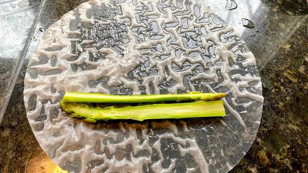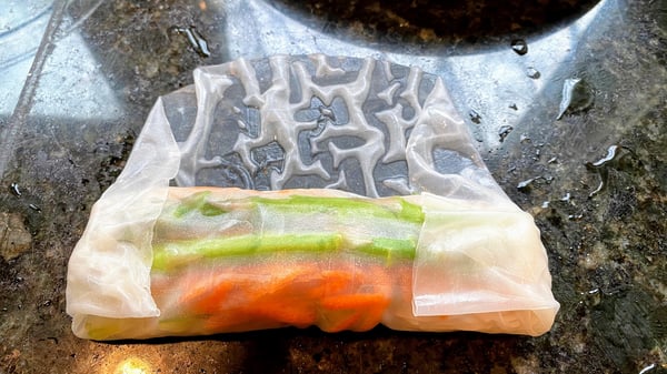 - Once the wrapper is ready (remember… we’re only making one at a time), place the wet wrapper on a plastic cutting board, your counter, or on a sheet of plastic wrap. We’re avoiding anything that’s wood here. Wood will soak up the excess water, making the wrapper hard to work with. Keep in mind that as soon as you make your spring roll and transfer it to a platter, the extra water will soak into the wrappers, and they’ll have the perfect balance of soft and chewy.