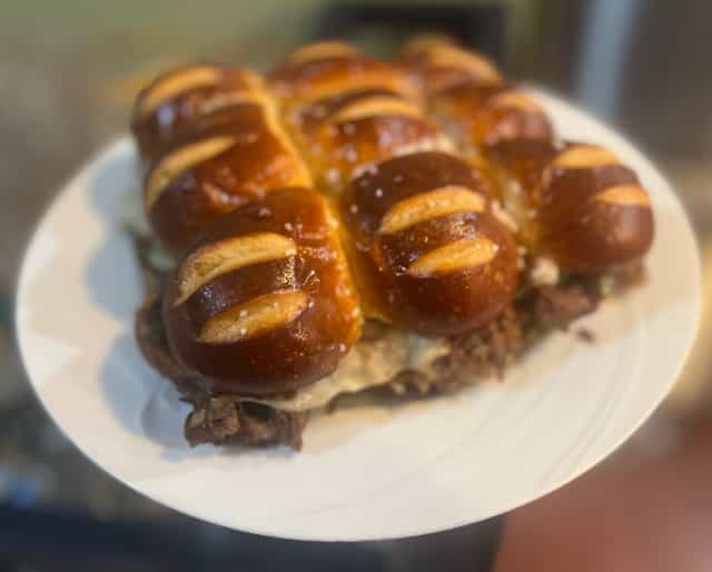 In my Super Bowl blog last year, I explained that I try to focus some of the snacks to reflect the teams playing, in addition to having some standard fare like chicken wings, pizza, chips, etc. I paid homage to Kansas City last year and shared my recipe for my Taylor Swift-Travis Kelce inspired pigs in a blanket with chili cheese dip. This year, I’m switching teams, and focusing on some classic Philadelphia foods – cheesesteaks and soft pretzels. In fact, I found a way to combine the two in Philly Cheesesteak Pretzel Sliders.