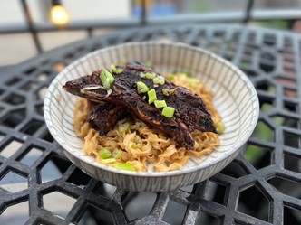 7. Plate the ribs and top with remaining scallions and sesame seeds. Serve with rice, lettuce leaves, or in my case, soy-sesame noodles.