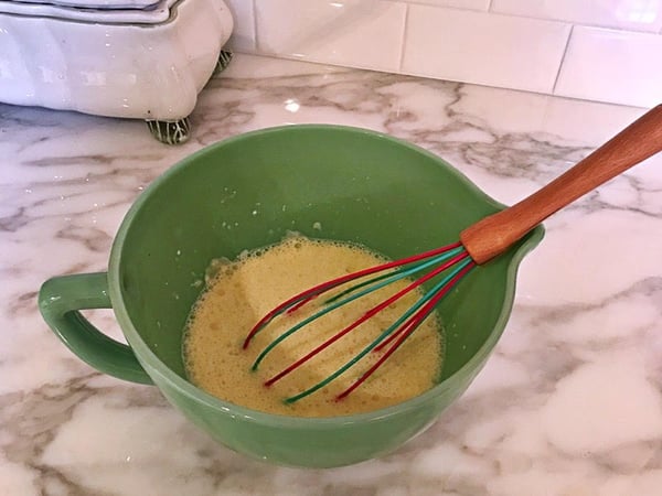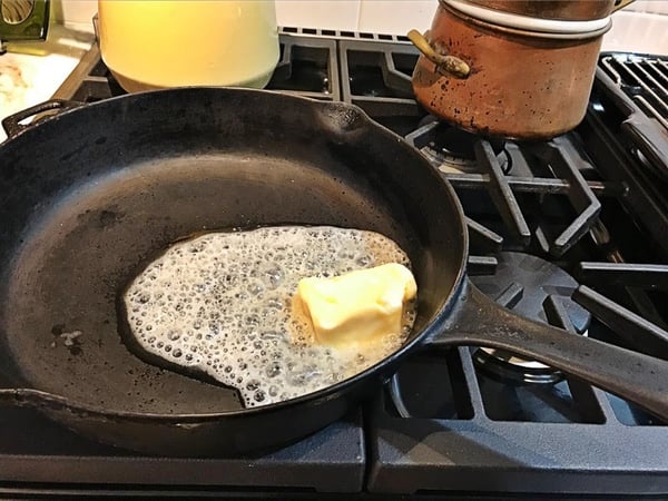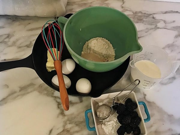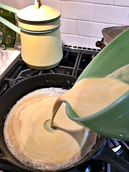 Combine all ingredients except the butter and whisk rapidly until foamy. Set aside for 20 minutes to rest. While batter is resting, place skillet in oven to heat.