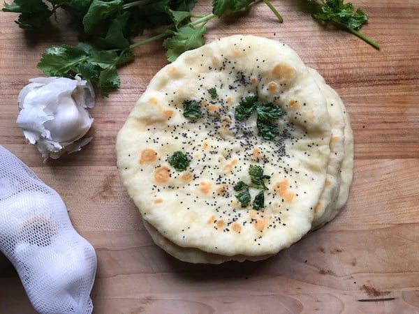 For this naan recipe I kicked it up a notch and rolled fresh garlic, poppy seeds and cilantro into the dough before pan frying. So good!