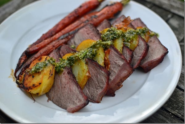 Marinate the beef for at least an hour, but preferably overnight. Bring to room temperature before grilling. Cook the beef for about 5 minutes a side over the hot coals, then move to the “cold” side of the grill. I finished cooking this beef on indirect heat, meaning my coals are on one side and the other side is “cold.” I kept my grill temperature around 225-250 and grilled the meat to an internal temperature of 190, then let it rest 30 minutes before slicing.