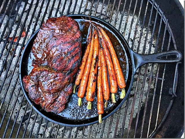 For the last 30 minutes of cooking, I put my beef in a cast iron skillet, added the whole carrots (that I used to chop off the carrot tops) and cooked them together.