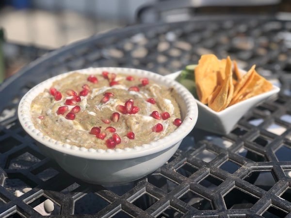 9. Place eggplant dip into serving bowl and swirl with 1-2 tbs of Greek yogurt and top with pomegranate seeds. Serve with pita chips and crudité!