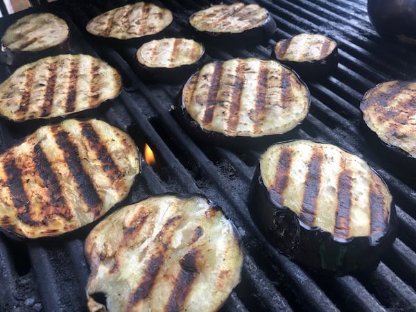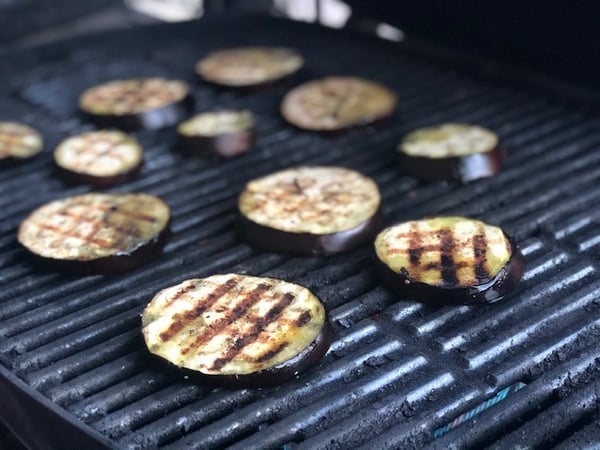 - Grill eggplant over direct heat for 3 minutes, or until you have good color/grill marks.