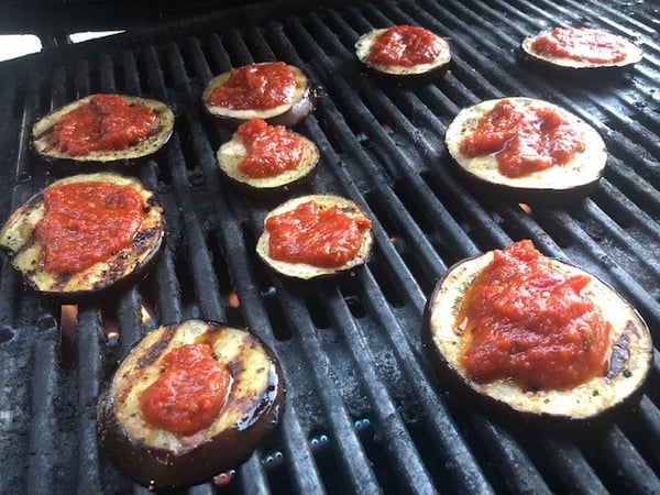 8. Add about 1 Tablespoon of tomato sauce on each slice of grilled eggplant (don’t overdo it) trying not to drip over the sides.