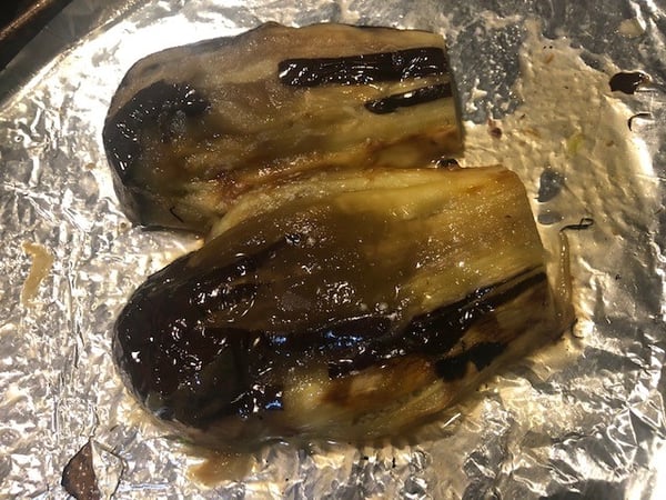 6. Once the eggplant is cool enough to handle, cut it in half, and remove as much skin as possible (some is okay).