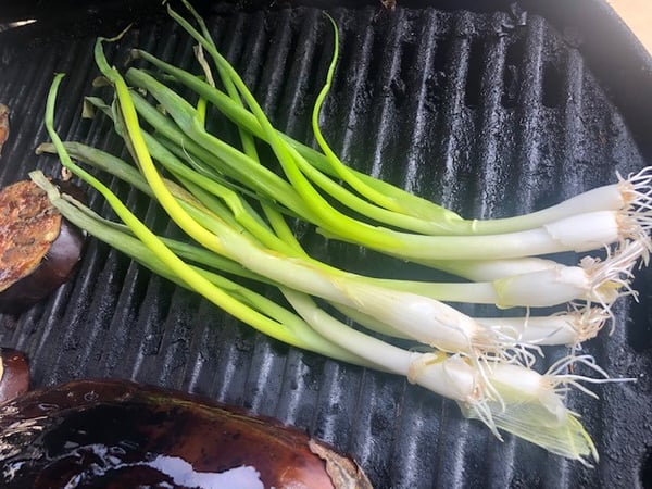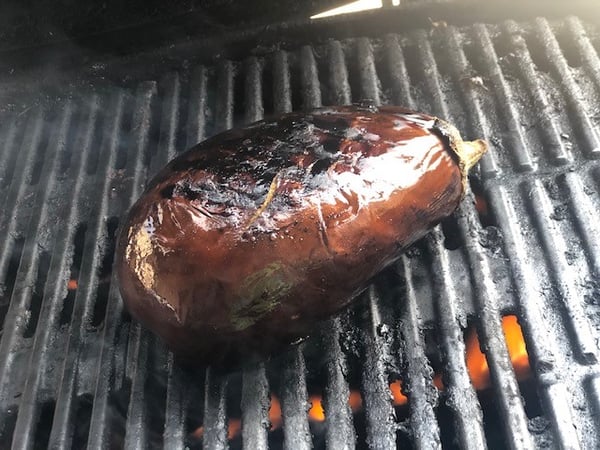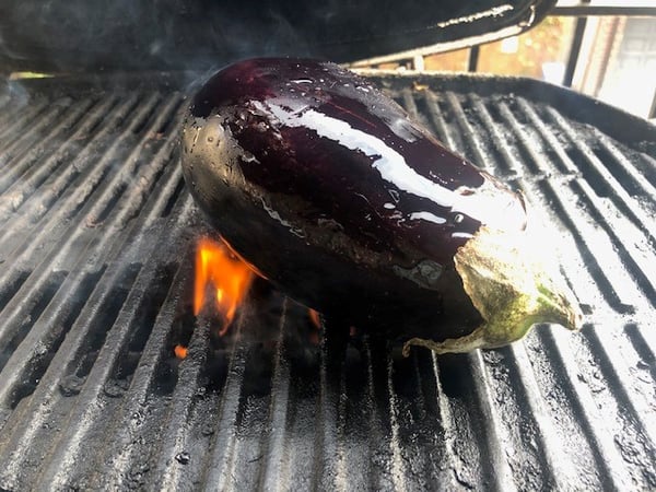 4. Close the lid, opening occasionally, to turn the eggplant and char all sides (about 15-20 minutes). Remove the onion once charred (about 5 minutes), set aside.