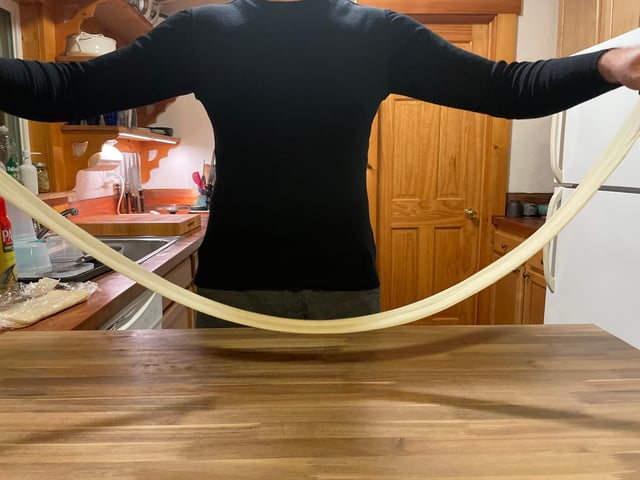 Now the fun part! Bring a large pot of salted water to a boil, then unwrap one noodle portion and holding it from the very ends gently pull until it stretches to about 18’ in length. Then repeatedly lift it up and smack it against the table top while gently widening your arms to stretch the noodle. The combination of smacking and stretching will allow the noodles to reach a length much greater than just your arm span.