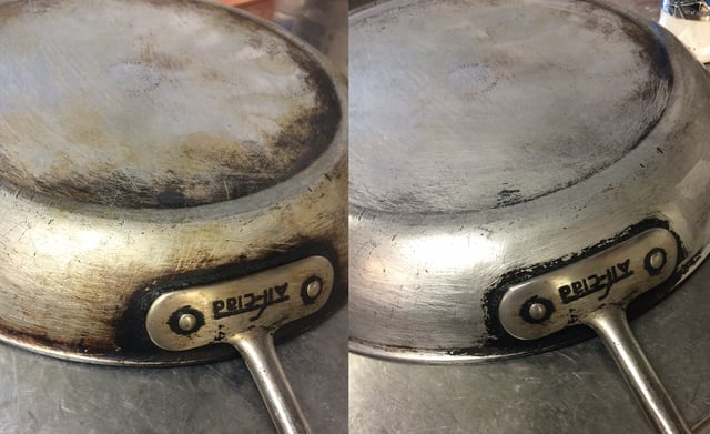 Here’s a before and after shot of what five minutes of work gets you. With a little scrubbing on this stainless steel All-Clad pan, I removed all of the brown residue, a lot of the black build up, and gave the steel a nice sheen.