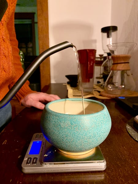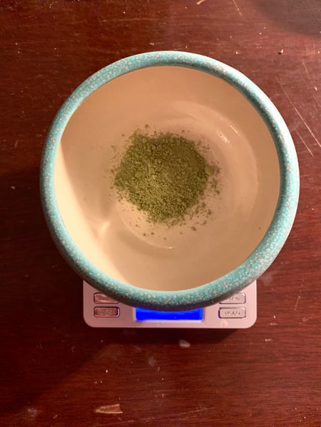 Matcha is traditionally made in a small wide bowl. This allows for the proper movement of the whisk during brewing to create the characteristic foamy head. Into your bowl, measure 2.5 grams of matcha powder (about 1.5 teaspoons)
