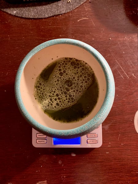 Once your powder is measured add about 30 grams of water, and use the whisk to incorporate the powder into the hot water, breaking up any clumps. Allow it to sit for about 20 seconds unperturbed. This process allows the powder to hydrate and begin releasing flavor before you add the final liquid.