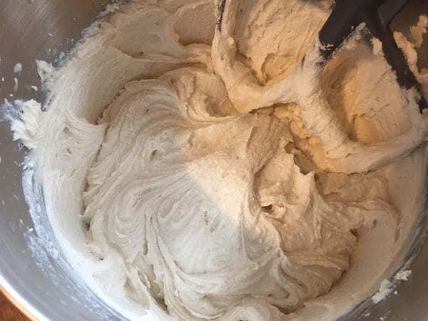 4. Slowly pour in 1/2 cup of the stock while beating.