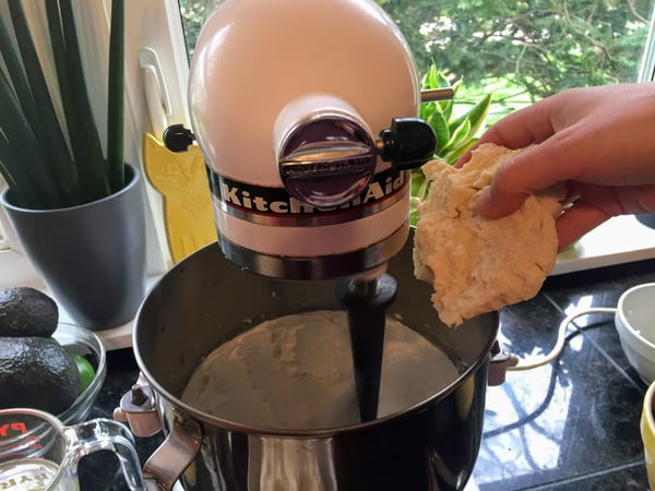 2. Mix together the dried masa and 1 cup hot water to form a stiff dough. Cool to room temperature.