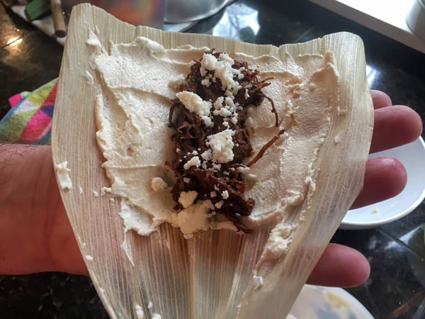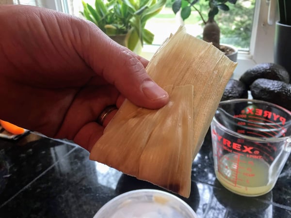 Besides procuring the masa harina, you’ll need to get your hands on dried corn husks, which can usually be found in the same aisle. Because they are dried and brittle when you purchase them, you’ll need to soak them in hot water to make them pliable. This takes about an hour.