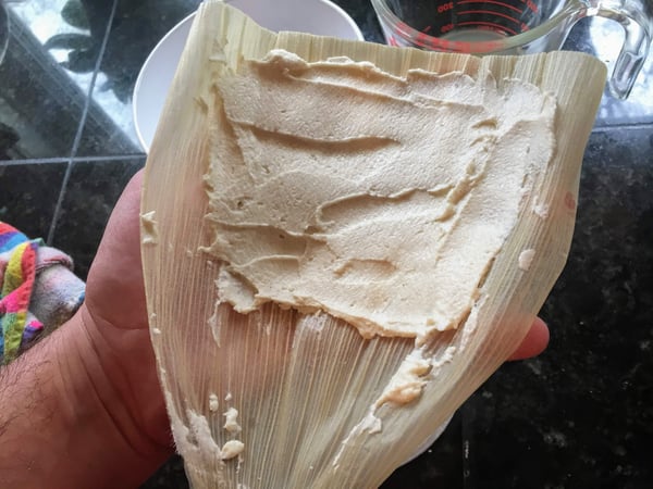 - Lay a husk down, lightly pat it dry, and then spread 1/4 cup batter into about a 4-inch square, covering the wider end of the husk. Leave a 1-inch border on one of the sides. Spoon 2 tablespoons of the filling into the center of the square.