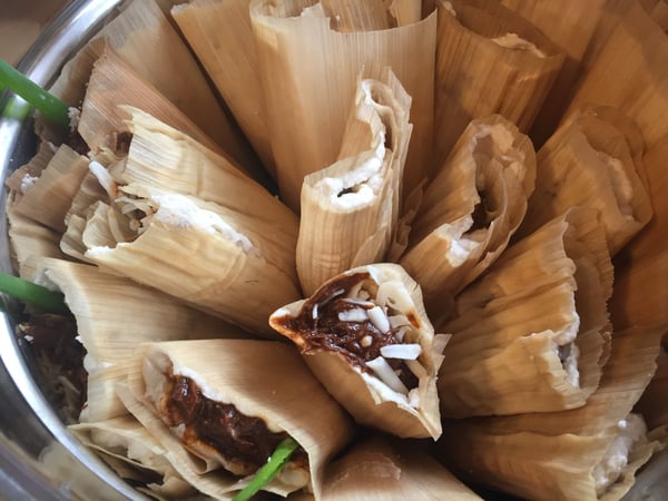12. The tamales are done when the wrappers peel away easily and the masa filling is set.
