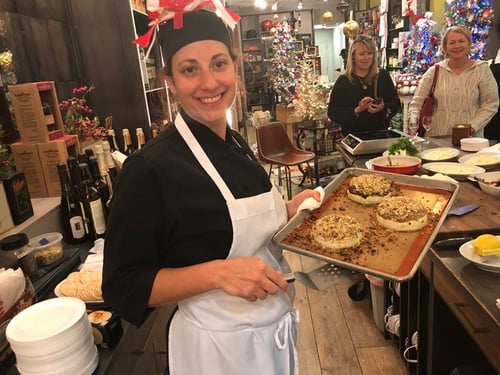 Chef Maria Clementi first added mayo on one side, mustard on the other, then the ham, Swiss cheese and pork. Then it was time to grill! She used two Lodge cast iron pans, one with melted butter to place the sandwiches on and the other to place on top and to create a griddle effect. The air was filled with the smell of melting cheese and butter, and everyone’s stomachs were rumbling at this point.
