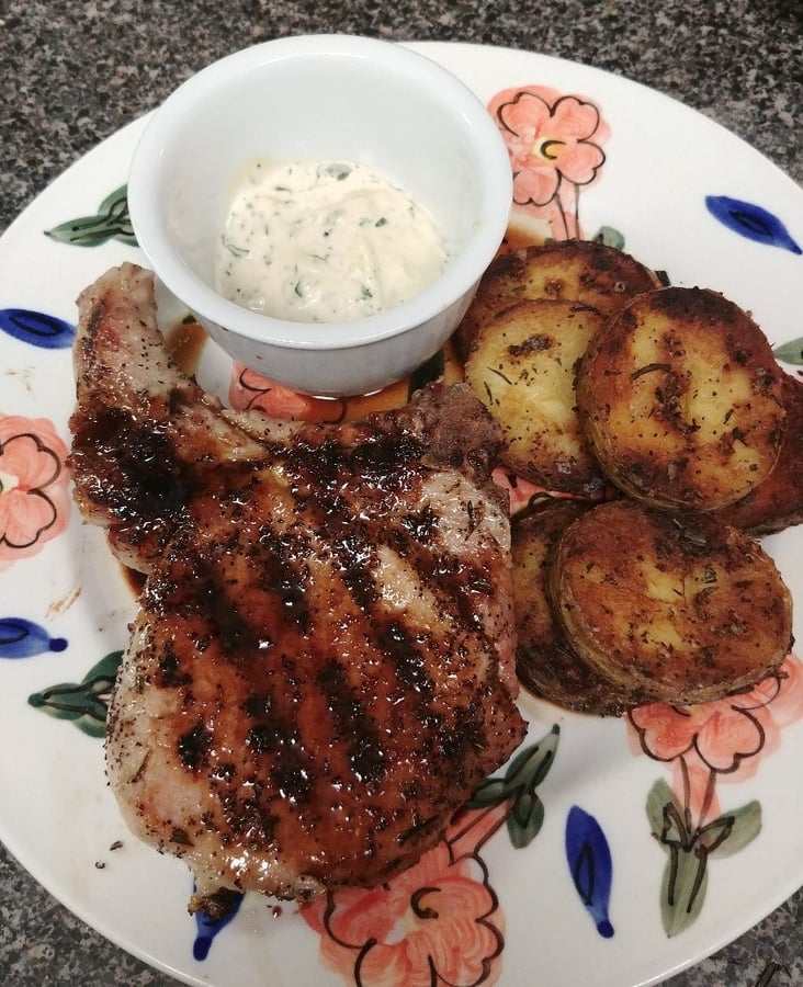 Grilled and balsamic-glazed pork chops with pan-fried potato rounds (so soft and fluffy inside) and an herb-Dijon-mayo sauce for dipping. Delicious, and just look at those grill marks!