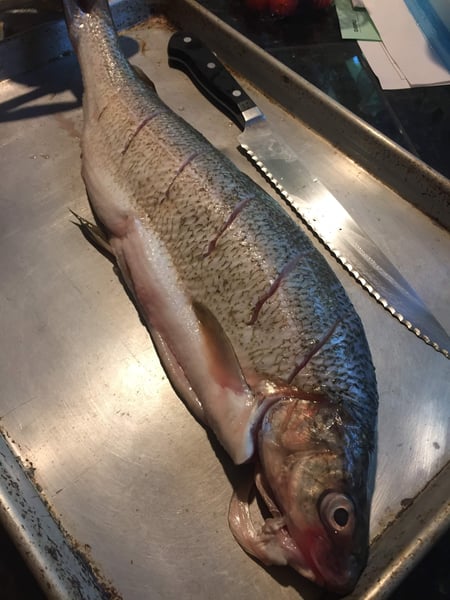 Preheat your gas or charcoal grill over medium-high heat. While your grill is heating, prepare the fish. Using a sharp knife and starting behind the head, make slashes through the skin of the fish going about 1/2 inch deep into the flesh.